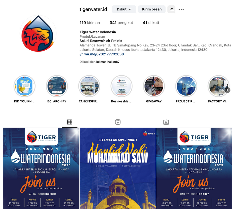 Membangun Instagram Tiger Water Solutons dari offline ke online, kini mencapai 341 followers.